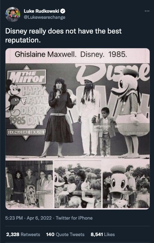 It’s going to be very hard for Disney to claim that it’s not a pro-pedophile organization when it literally took donations from the world’s most infamous (still) living pedophile and “groomer to the stars.”