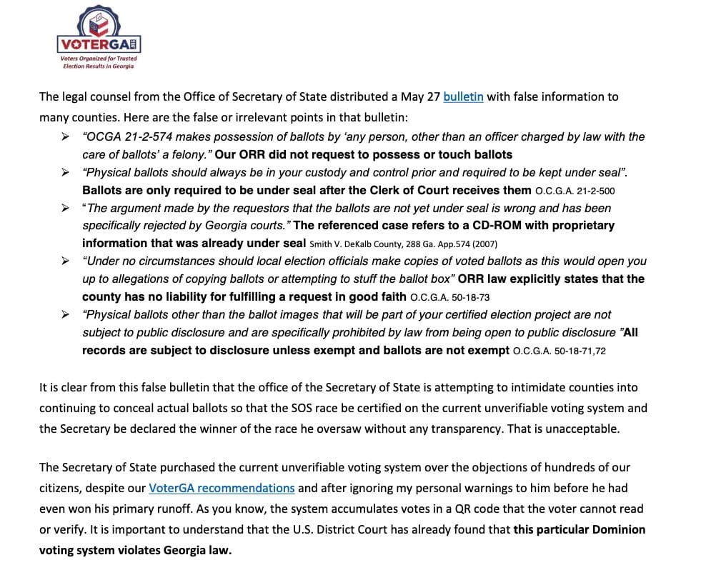 VoterGA’s letter went on to claim that the Secretary of State’s office was trying to intimidate Georgia’s counties from fulfilling open records requests by distributing bulletins with false information. That’s the office of the notorious Brad Raffensperger — in case you forgot!
