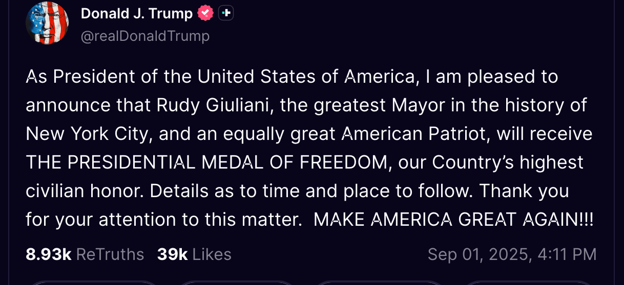 President Trump announced on his social media platform Truth Social: “As President of the United States of America, I am pleased to announce that Rudy Giuliani, the greatest Mayor in the history of New York City, and an equally great American Patriot, will receive THE PRESIDENTIAL MEDAL OF FREEDOM, our Country’s highest civilian honor. Details as to time and place to follow. Thank you for your attention to this matter. MAKE AMERICA GREAT AGAIN!!!”