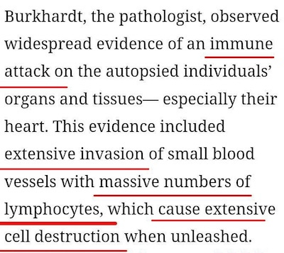 It seems obvious to me, having researched this subject for over 50000 hours, that the mechanism of action whereby the cells of the body are instructed to produce and present foreign proteins shall inevitably lead to an auto immune attack by the bodies “hidden assassin” cd8 killer t cells. This shall, if the protein presents there, result in cellular damage anywhere in the body.